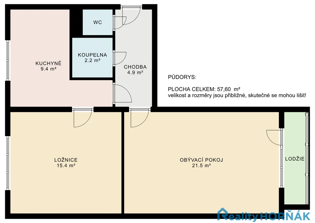 Dispozice bytu nabízí pobytové místnosti: obývací pokoj (5,47 x 3,40 = 18,6 m2) s předloženou lodžií (3,05 x 0,91 = 2,8 m2), ložnici (4,09 x 3,39 = 13,9 m2) a kuchyni (3,37 x 2,13 = 7,2 m2), a dále předsíň (3,40 x 2,02 = 6,9 m2), koupelnu (1,50 x 1,43 x = 2,1 m2), WC (0,84 x 1,13 = 1,0 m2) a chodbičku do kuchyně (1,49 x 0,92 = 1,4 m2). Příslušenstvím bytu je sklepní kóje (2 m2).