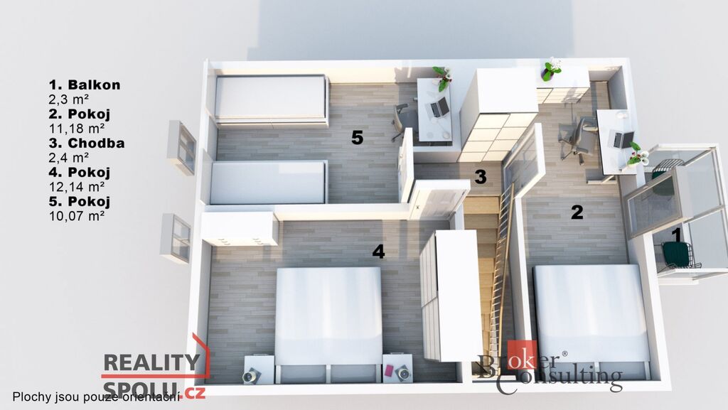 Tři pokoje, z nichž jeden má vstup na balkon s krásným výhledem do okolní přírody. Pokoje jsou vhodné jako ložnice, dětské pokoje nebo pracovna.