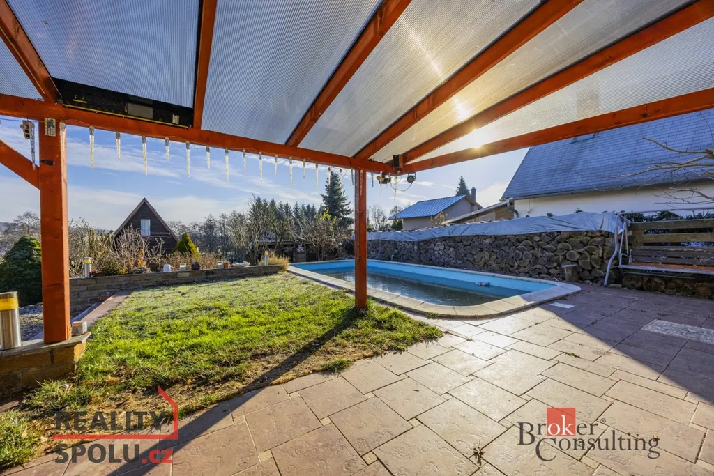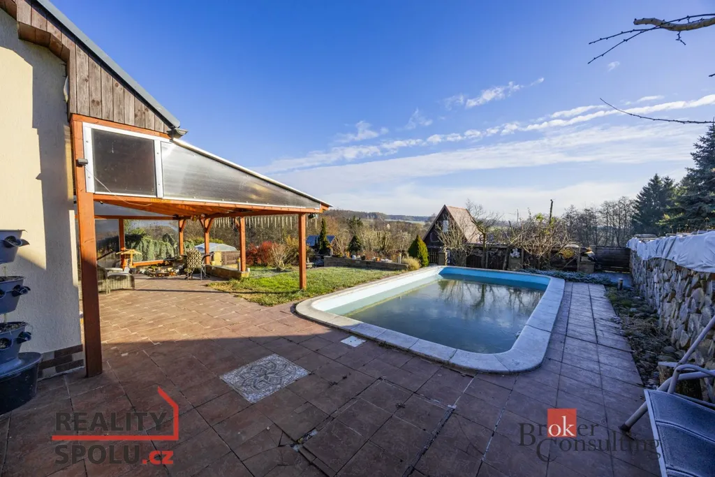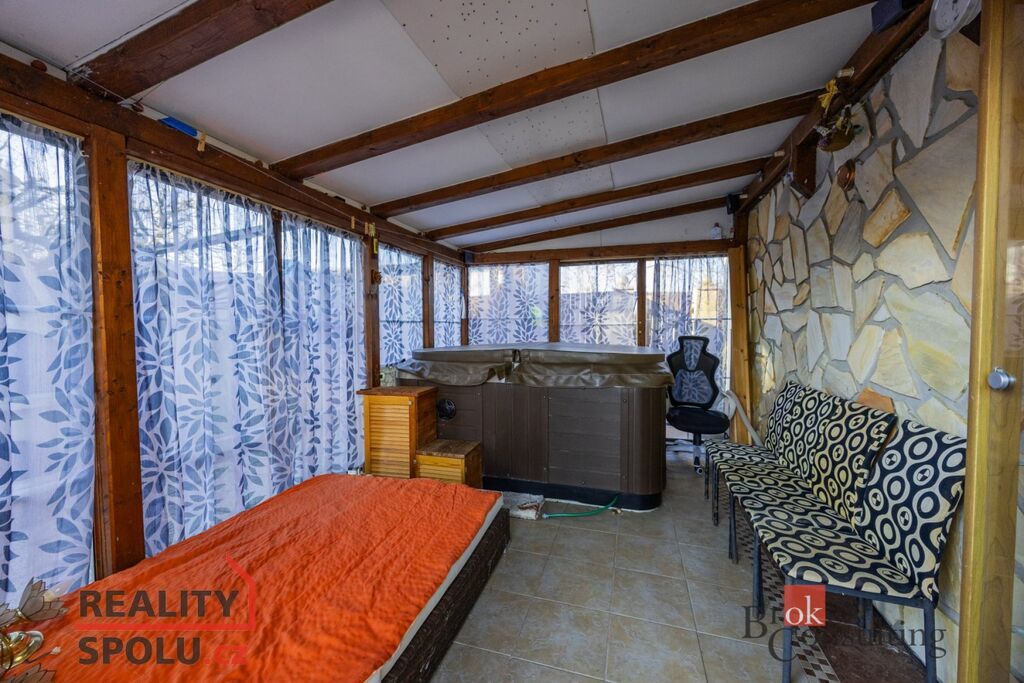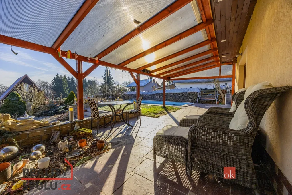 Součástí domu je již zmíněná zastřešená terasa, umožňující příjemné posezení i za horšího počasí. K domu je přistavěná také část s infrasaunou s přímým výhledem do přírody při saunování. Další místnost slouží jako zahradní veranda či párty místnost a je vybavena luxusní vířivkou. Zahrada je architektonicky navržená a členitě řešená, s dekorativními zákoutími, příjemným osvětlením i ozvučením pro večerní atmosféru. Dominantou celého venkovního prostoru je velký bazén. Nedílnou součástí je také samostatná dílna, ideální místo pro kutily, hobby práce, domácí projekty nebo bezpečné uložení nářadí.