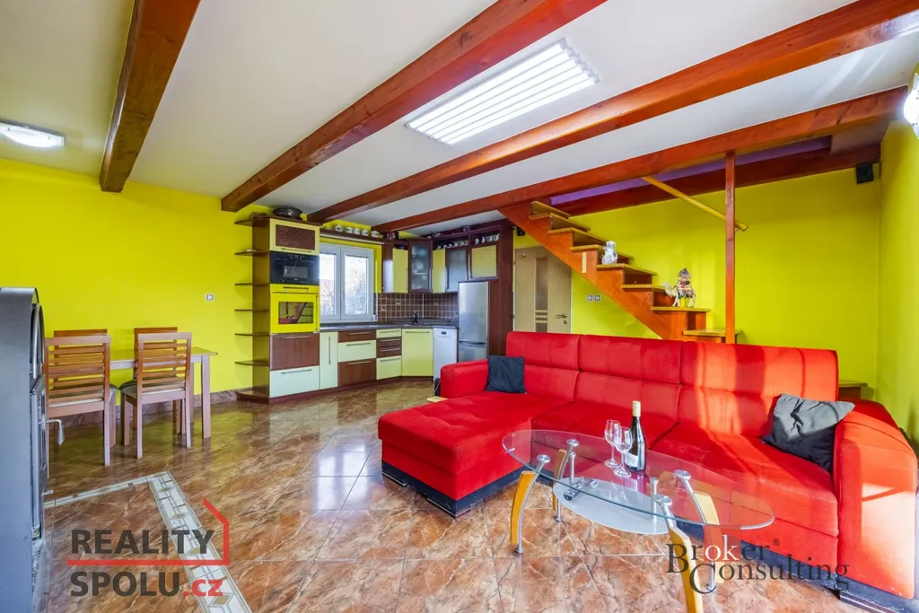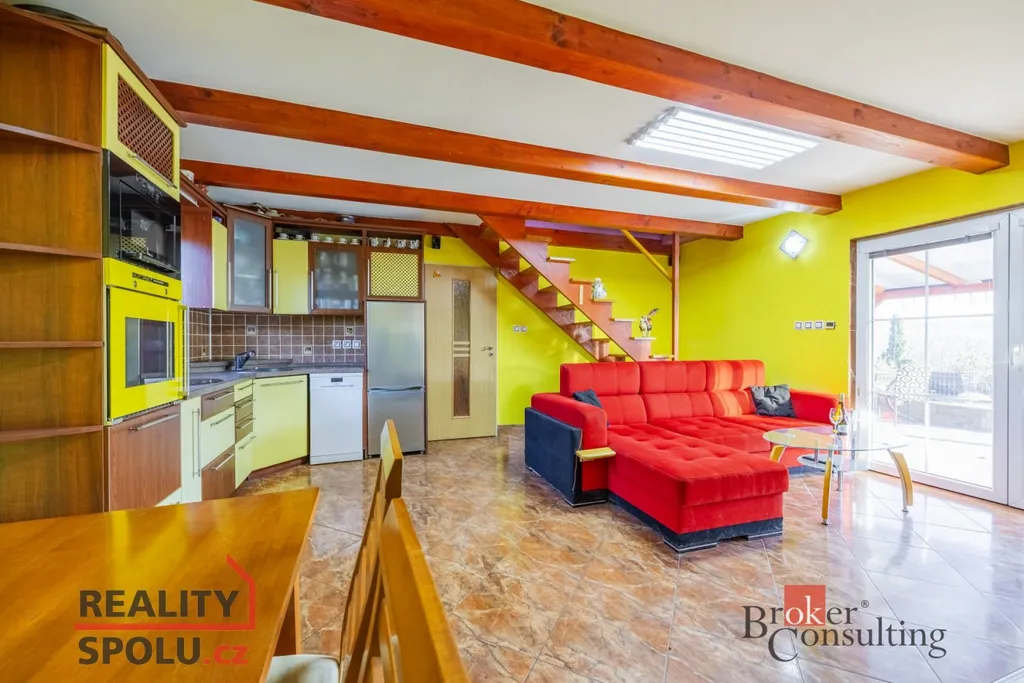 Vstupní chodba, koupelna s masážní sprchou a toaletou a prostorná kuchyň propojená s obývacím pokojem. Z obývací části vedou schody do patra / podkroví, zároveň je zde velké francouzské okno, kterým se vstupuje přímo na zastřešenou venkovní terasu s nádherným výhledem do přirody na koně a ovečky.