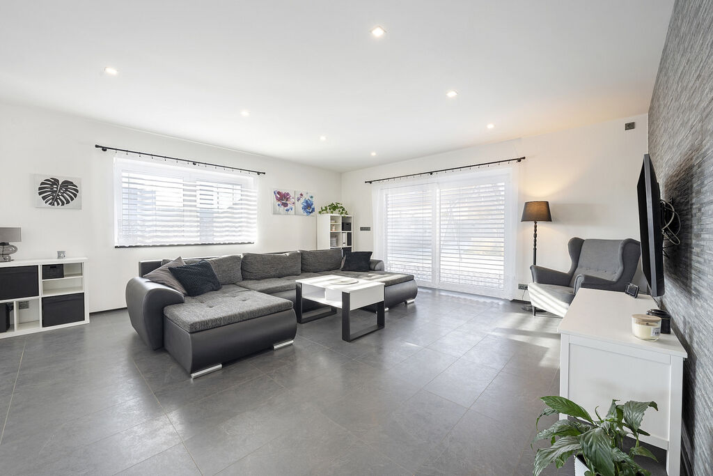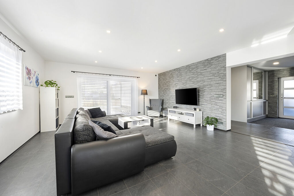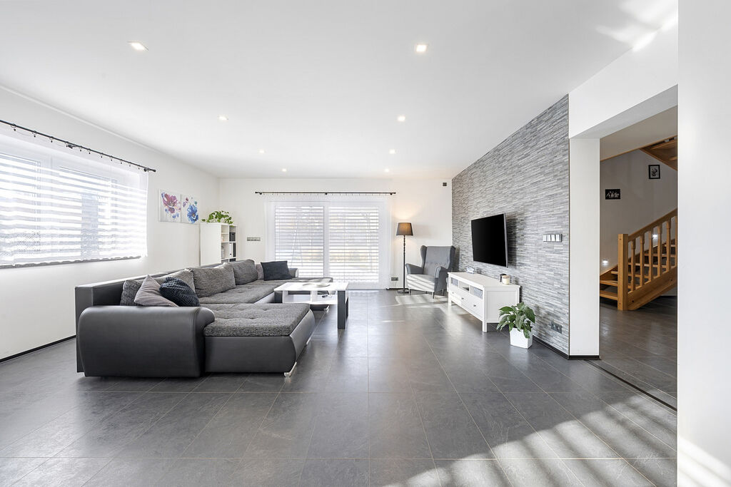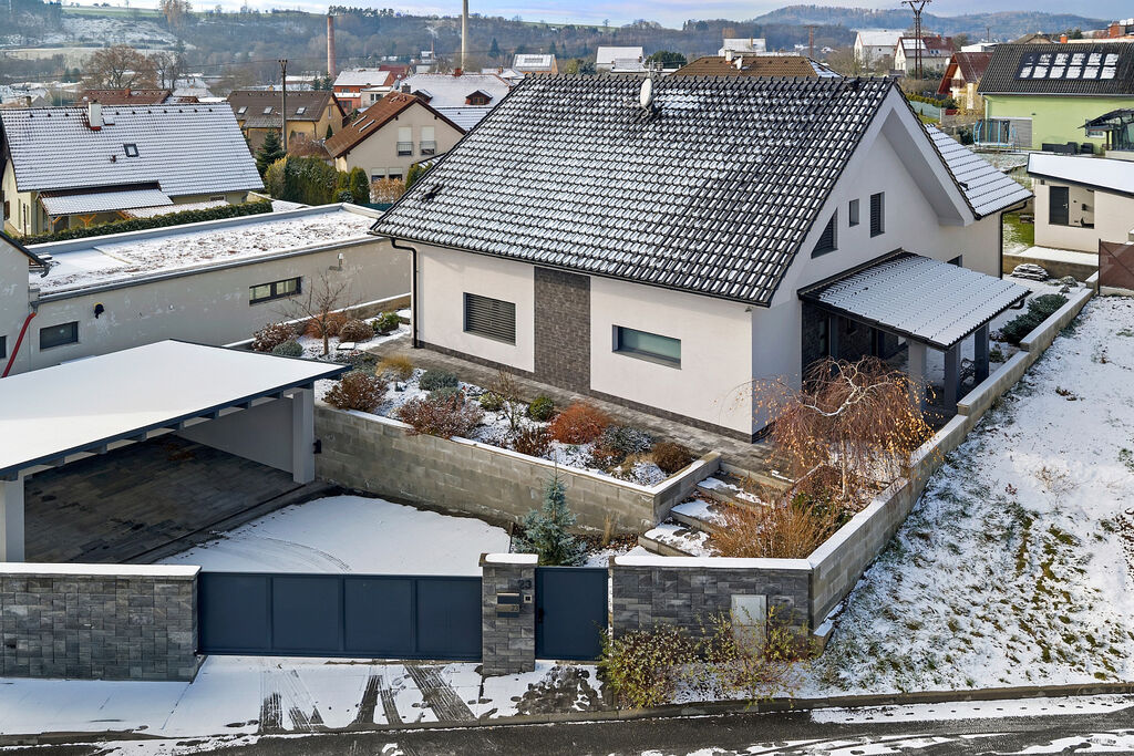 Další úspora při provozu domu je zajištěna například využíváním užitkové vody z vrtané studny. Nemovitost je samozřejmě napojena i na obecní vodovod a dále na kanalizaci.