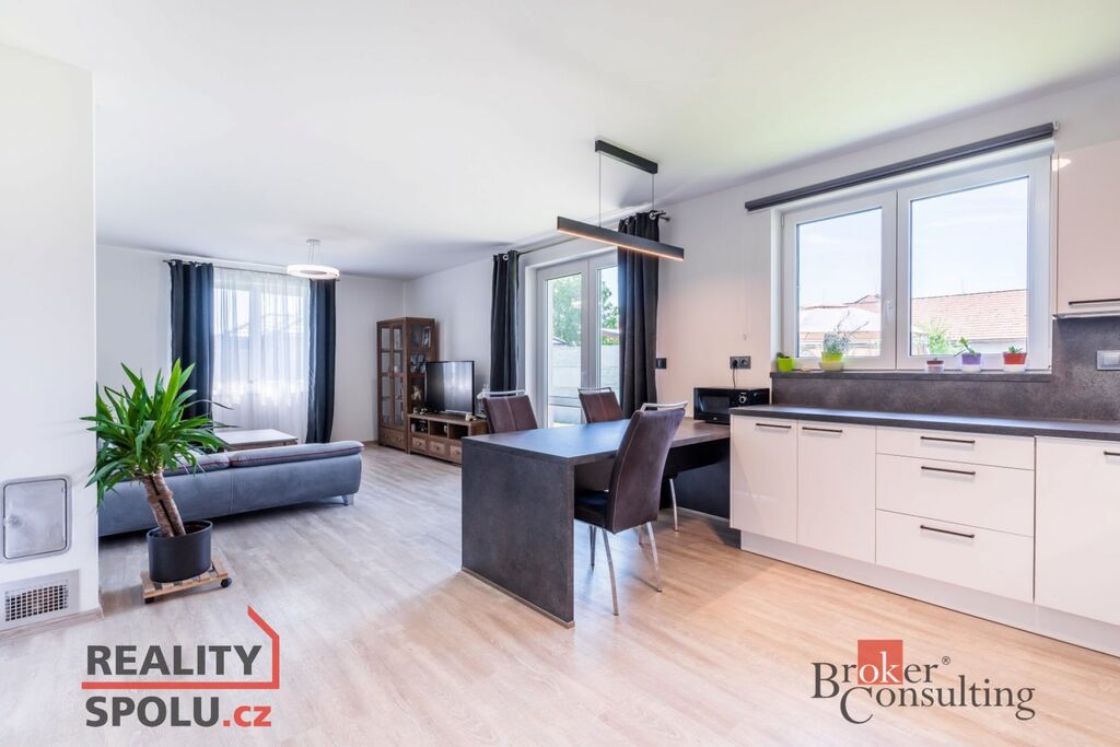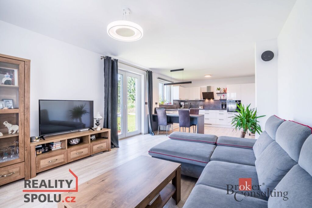 - Obývací pokoj propojený s kuchyní a jídelním koutem