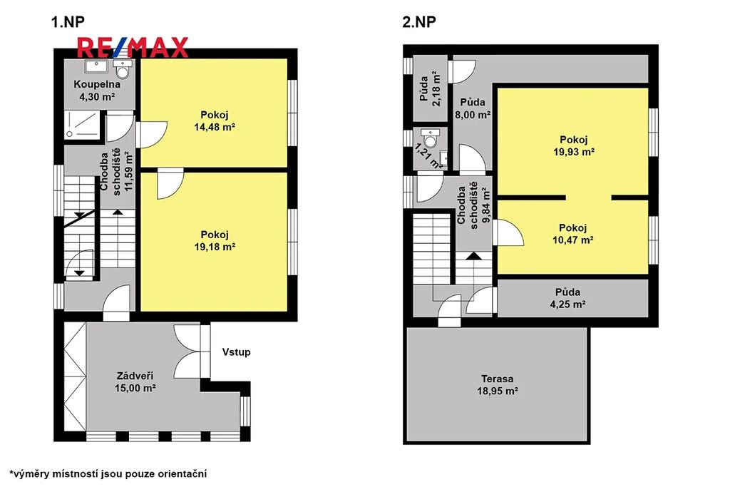 2. NP: dva pokoje a koupelna s WC, vstup z přední části domu přes prostornou chodbu.