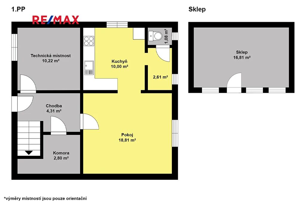 1. NP: kuchyň se spotřebiči, jídelna, obývací pokoj, WC, komora, technická místnost (plynový kotel), sklep s dílnou, vstup na zahradu.