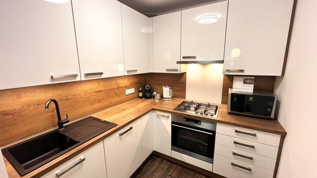 Dominantou bytu je obývací pokoj s kuchyní (cca 24 m2). Celý prostor působí velmi vzdušně a čistě. Vstup na lodžii je z obývacího pokoje.