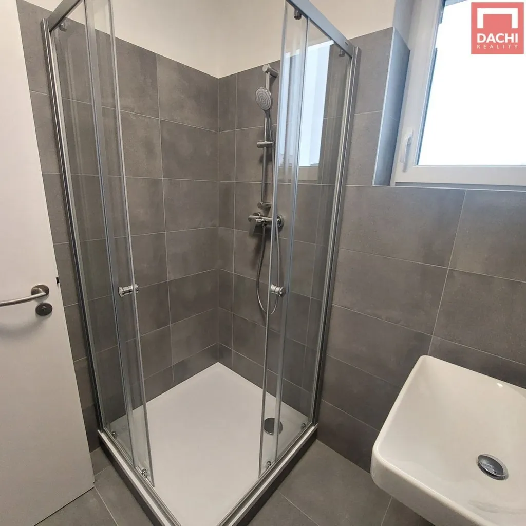 Koupelna: Vybavena sprchovým koutem, umyvadlem, zrcadlovou skříňkou, topným žebříkem a připraveným prostorem pro pračku a sušičku.