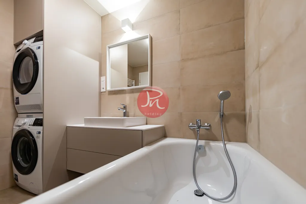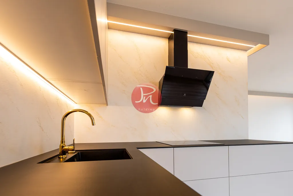 Tento byt je výjimečný jak svým designem, tak i vybavením. Interiér byl navržen s ohledem na maximální komfort a eleganci, použitím kvalitních materiálů, které podtrhují jeho luxusní charakter. Otevřený koncept obytného prostoru spojuje moderní kuchyni s obývacím pokojem, který nabízí krásný výhled a dostatek přirozeného světla. Kuchyň je vybavena prvotřídními spotřebiči, což uspokojí i ty nejnáročnější kulinářské fanoušky.