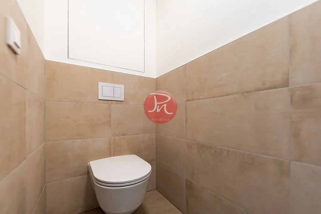 Ložnice je prostorná a vzdušná, ideální pro klidný odpočinek, s možností využití prostoru pro praktické úložné jednotky. Koupelna je vybavena moderním sanitárním zařízením a stylovými detaily, které vytváří harmonickou atmosféru.