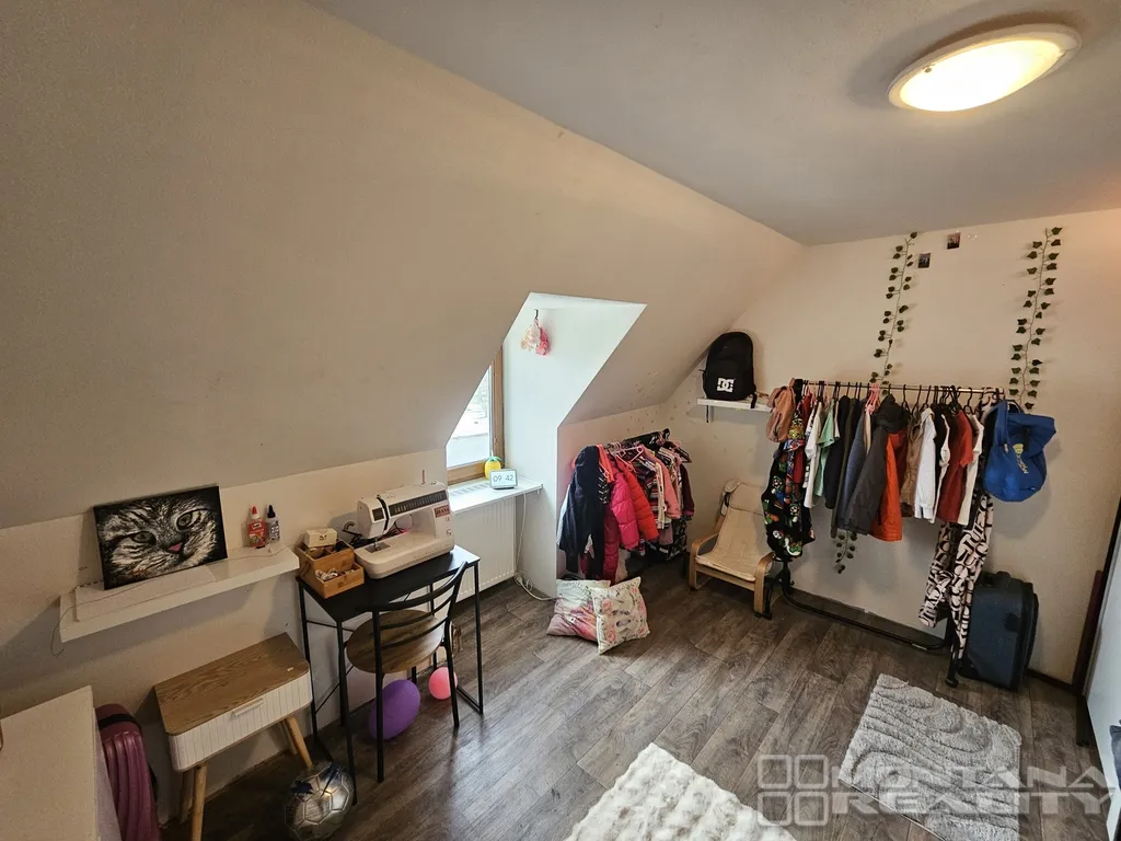 V patře se nachází dvě samostatné ložnice, prostorná chodba využívaná jako herna pro děti, malá koupelna s WC a úložný prostor. Na chodbě jsou nachystané rozvody na instalaci kuchyňské linky což by umožnilo dům využívat dvougeneračně.