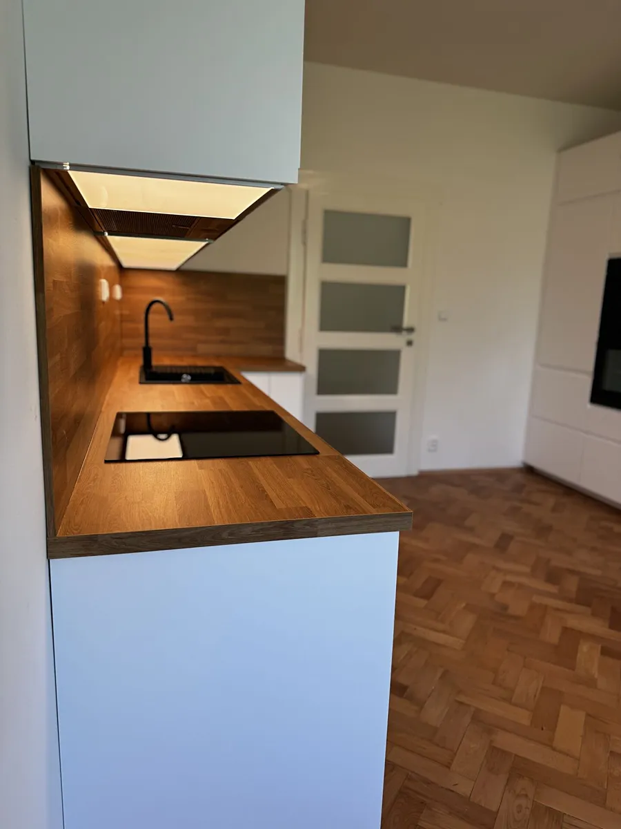 V rámci kompletní rekonstrukce byly dělány nové rozvody vody, elektřiny, plynu, nové podlahy, štuky, stropy, nová koupelna, nový plynový kotel, nový vestavný nábytek na míru, nová kuchyňská linka s veškerými spotřebiči, rolety v oknech, přípojka na internet, v koupelně je podlahové vytápění.
