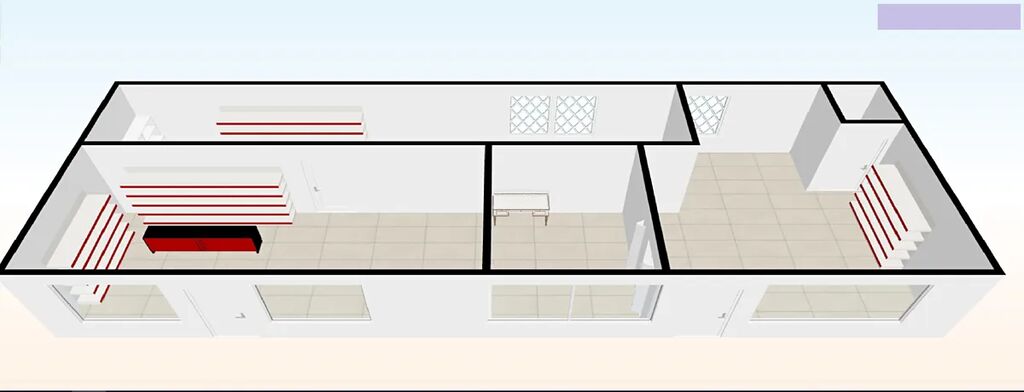 - prodejní plocha 36,3 a 34,6 m² s pěti prosklenými výlohami a dvěma přímými vstupy z ulice