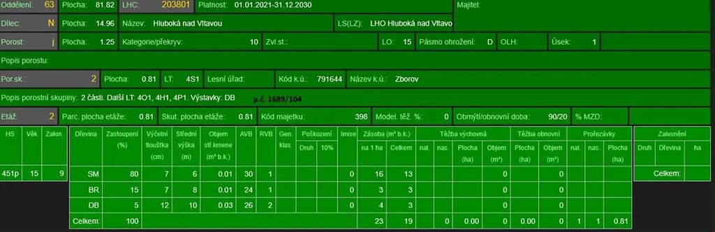 - p.č. 1689/122 vedená jako lesní pozemek o celkové výměře 23 149 m2, vlastníme podíl 1/8 tedy 2 894 m2 (stáří lesa 147 let - zastoupení dřevin smrk, borovice, stáří lesa 109 let - zastoupení dřevin borovice, smrk, stáří lesa 92 let - zastoupení dřevin borovice, smrk, stáří lesa 18 let - zastoupení dřevin borovice)