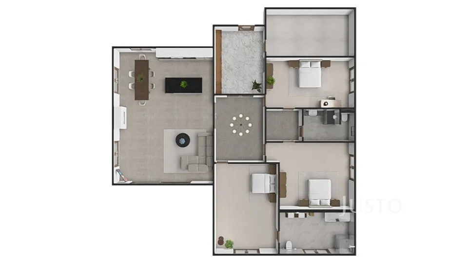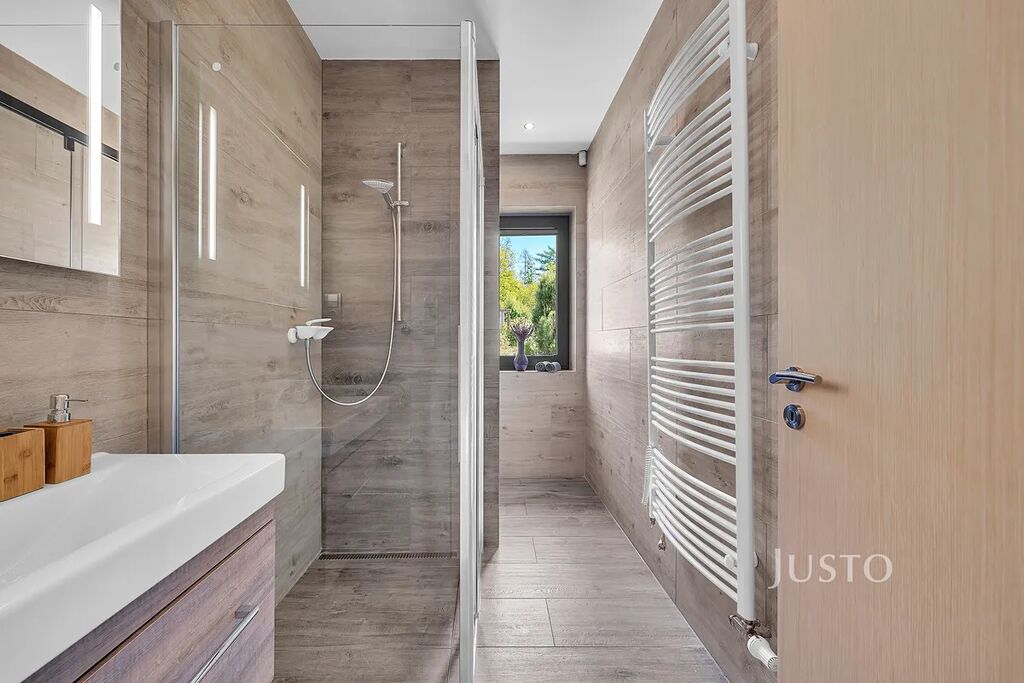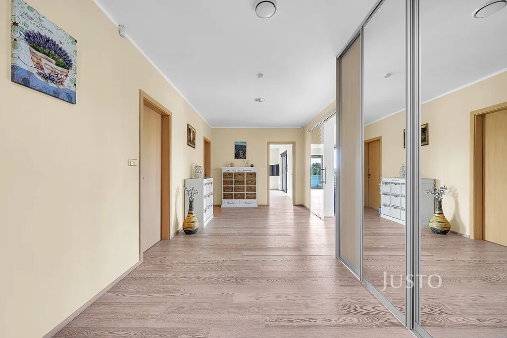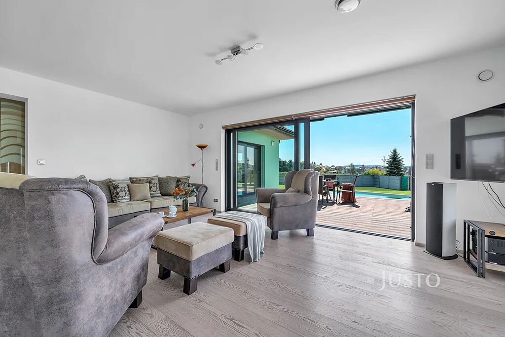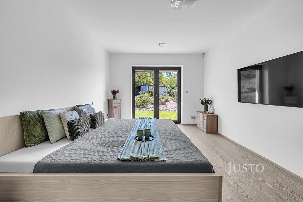 Dominantou vily je bezbariérový vstup na moderní terasu o ploše 32 m², kde si můžete užívat ranní kávu, rodinné snídaně, grilování i večerní posezení pod hvězdami. Děti zcela jistě ocení velkou zahradu o rozloze 3 135 m², která poskytuje nekonečný prostor pro hry, míčové sporty, stavění domečků nebo pikniky v trávě. V horkých dnech se zrelaxujte ve venkovním bazénu (47 m²) a užijte si soukromí za vzrostlými keři a plotem.