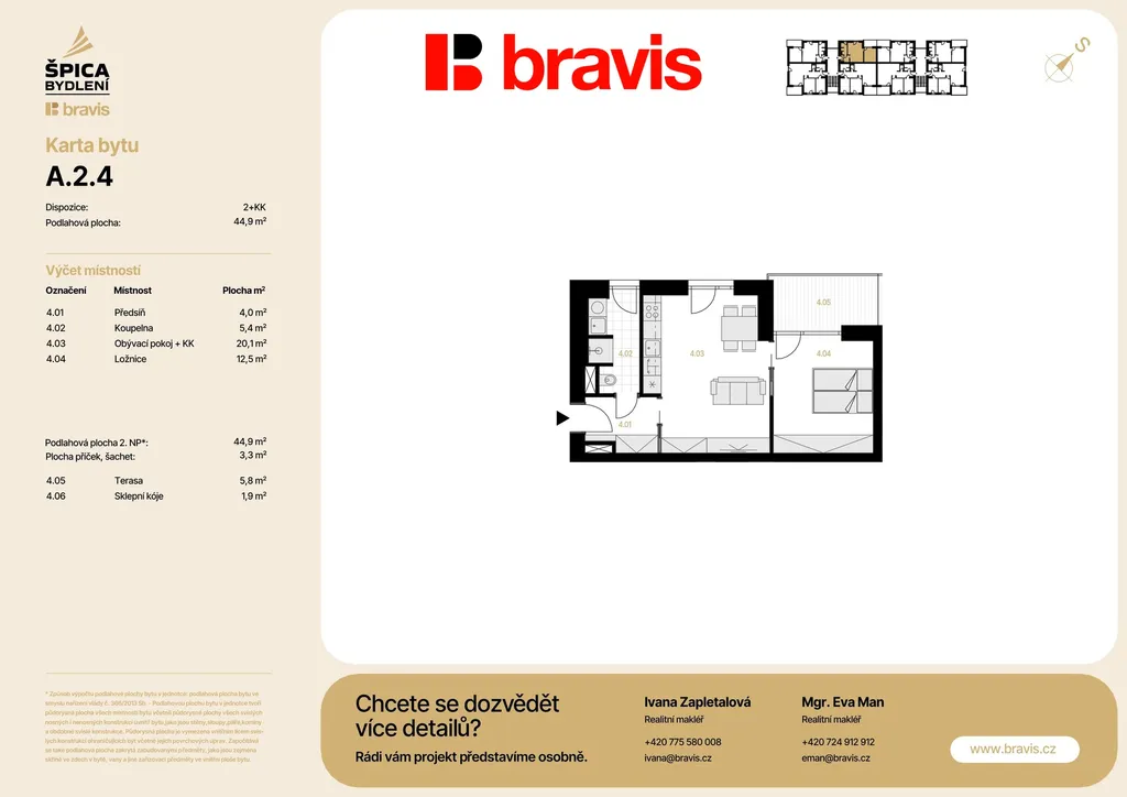 Nabízíme exkluzivní bytovou jednotku 2+kk (bytová jednotka A2-4) v novém projektu Špica bydlení — byt umístěný ve 2. NP nízkoenergetického bytového domu A. Celková podlahová plocha činí 44,9 m², navíc k ní náleží terasa 5,8 m², sklep a vlastní parkovací stání, což zajišťuje maximální komfort bez nutnosti dalších investic.