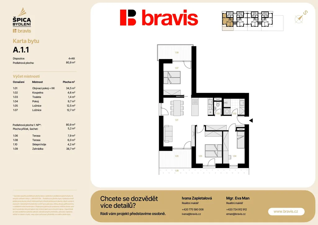 Nabízíme exkluzivní bytovou jednotku 4+kk (bytová jednotka A1-1) v novém projektu Špica bydlení — byt umístěný v přízemí nízkoenergetického bytového domu A. Celková podlahová plocha 80,9 m2 s terasou 14 m2, zahrádkou 38,7 m2, sklepem 4,2 m2 a vlastní parkovací stání, to vše v ceně bytu.