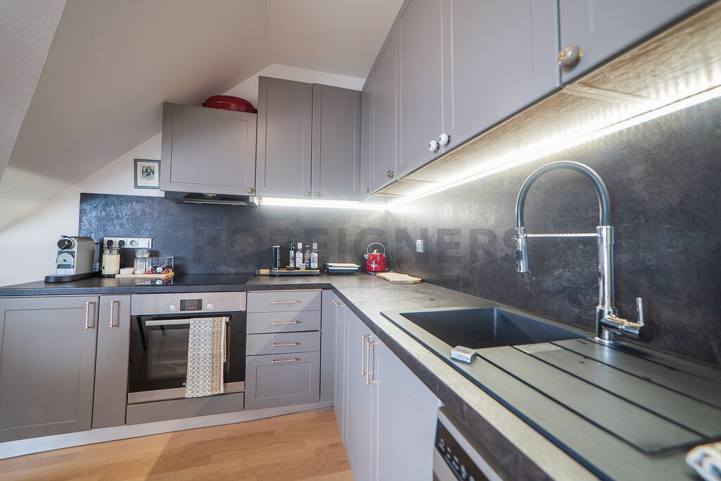 Byt se nachází ve 3. nadzemním podlaží novostavby bez výtahu a je vybaven klimatizací a stínícími roletami ve všech oknech. Celý interiér je navržen s citem pro detail – jemná barevná výmalba je vkusně doplněna kvalitními tapetami a moderní stěrkou. Dominantou je prostorný obývací pokoj s kuchyní a vstupem na slunný balkon s posezením, markýzou a krásným výhledem. Součástí bytu je ložnice, pracovna, stylová koupelna se sprchou, WC a bidetem a vstupní chodba s úložnými prostory.