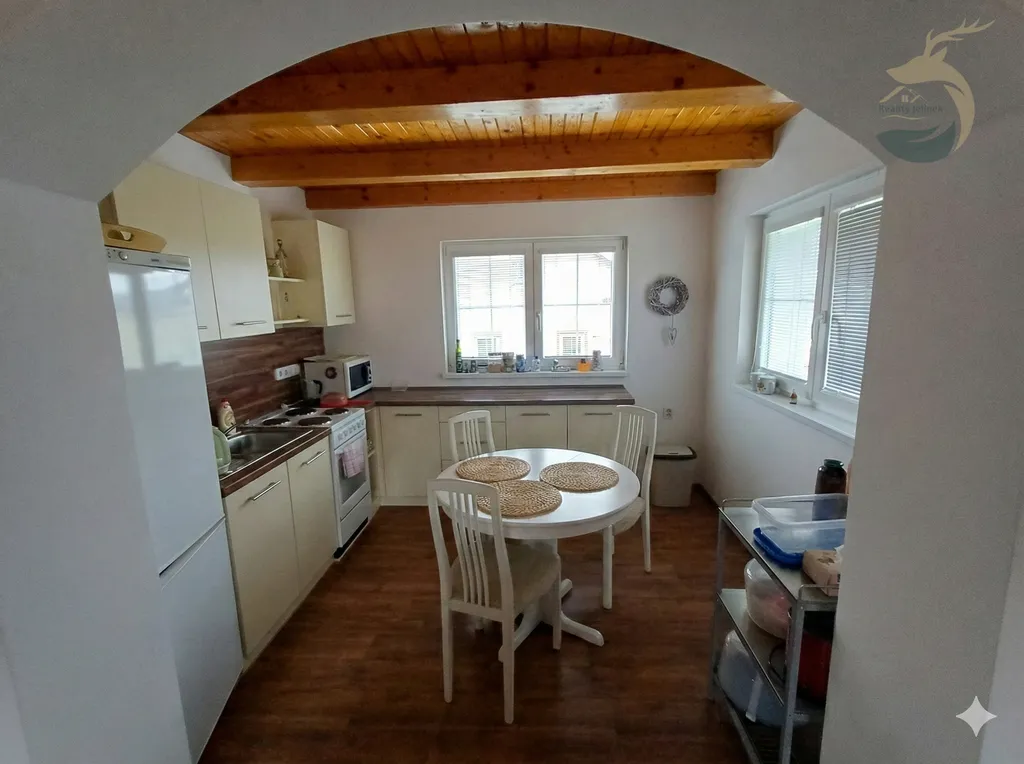 Vstoupíte do předsíně, odkud se otevře obývací prostor propojený s kuchyní, kde dominuje krb, který dokáže během chvilky vytvořit teplo nejen v místnosti, ale i v duši. V podkroví se nachází velký pokoj – ideální pro spaní, děti, hosty nebo jako romantické zázemí pod střechou.