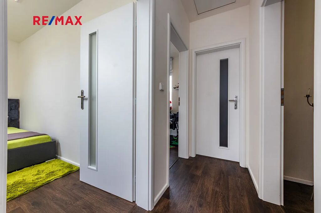 V patře domu se nachází klidová zóna. Jsou zde dva menší pokoje, ideální jako dětské ložnice, pracovna nebo pokoj pro hosty. Dále šatna a velkorysá hlavní ložnice, která poskytuje dostatek prostoru a pohodlí. Součástí této ložnice je vlastní koupelna, která zajišťuje naprosté soukromí a komfort. Z ložnice je zároveň přímý vstup na prostornou krytou terasu.