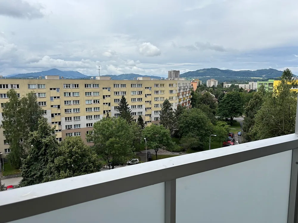 Pronájem bytu 2+1 s komorou a balkónem na ulici Zahradní v Místku. Byt o výměře 58 m2 se nachází v osmém patře šestnáctipodlažního panelového domu se dvěma výtahy.