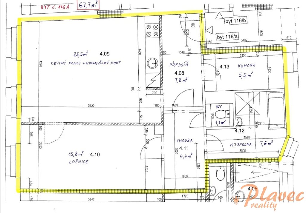 Dispozice: předsíň (7,8 m2), obývací pokoj s kuchyňským koutem (25,5 m2), ložnice (15,8 m2), chodba (4,4 m2), koupelna s vanou, sprchovým koutem a umyvadlem (7,6 m2), toaleta (1,1 m2), komora (5,5 m2).