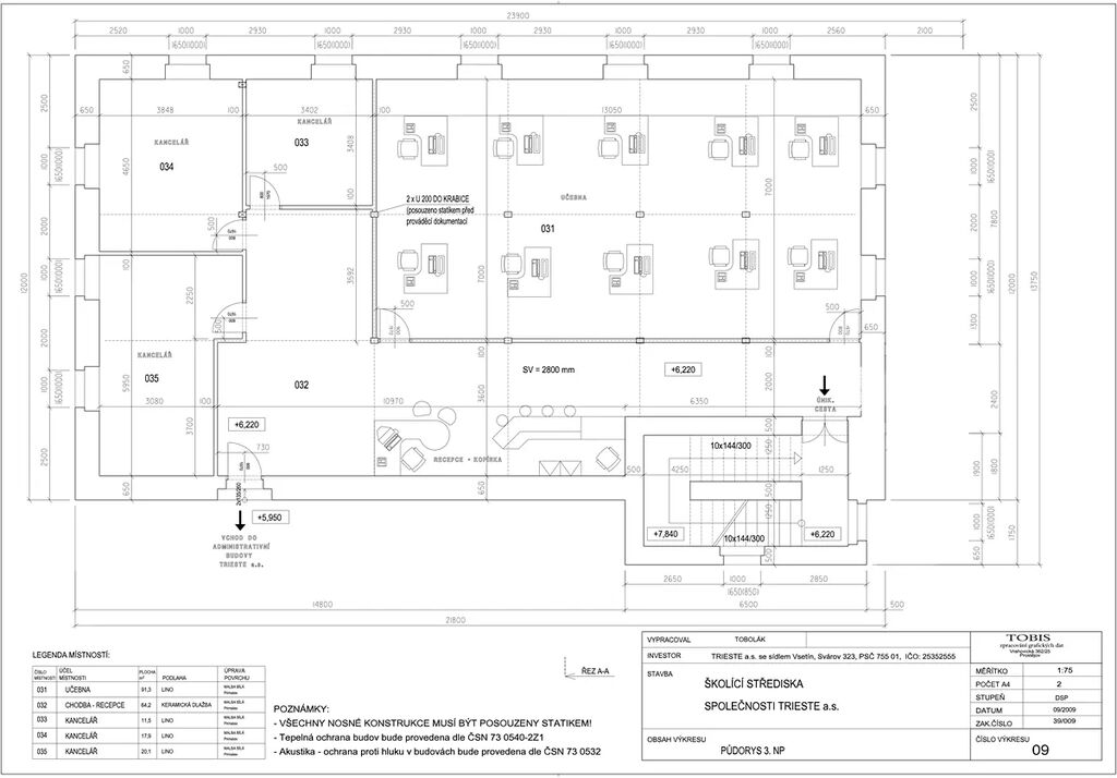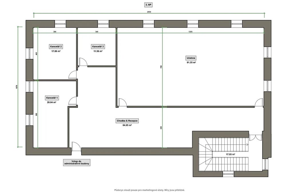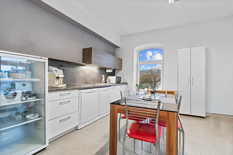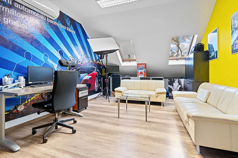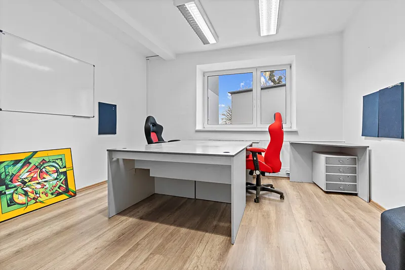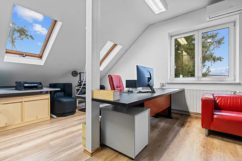 Dvoupatrový objekt s obytným podkrovím nabízí celkem 307 m² užitné plochy. Prostory lze využít jako kanceláře, technické místnosti či zázemí pro vedení společnosti. Budova má tři podlaží o ploše 128 m² na každém podlaží.