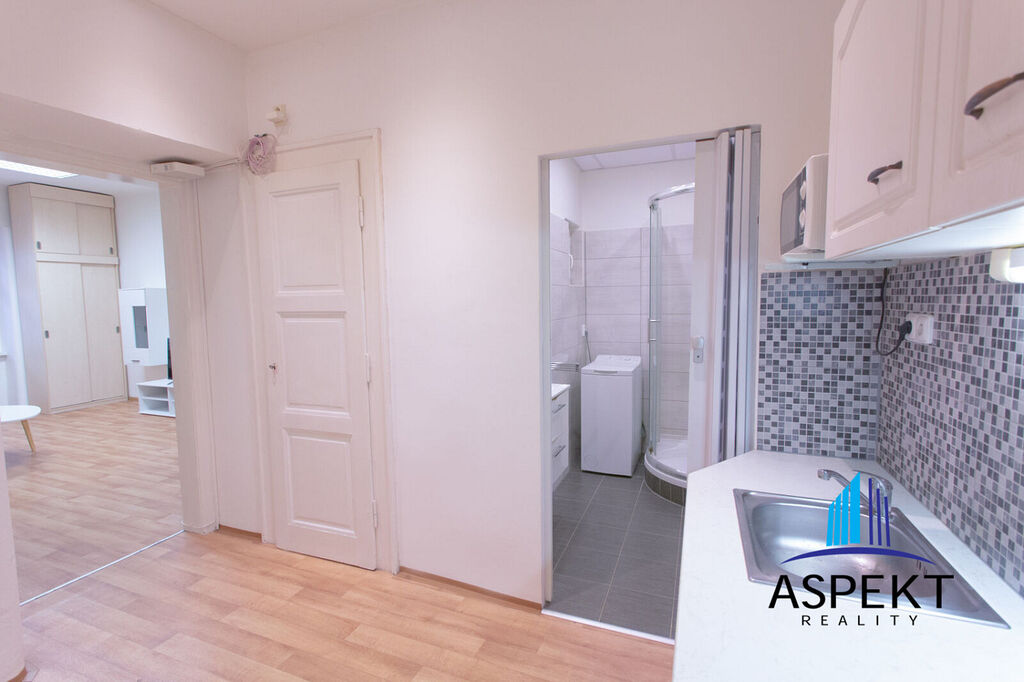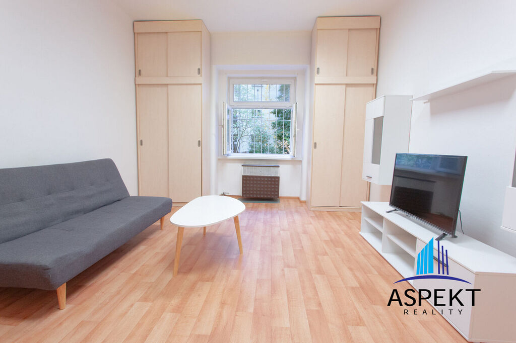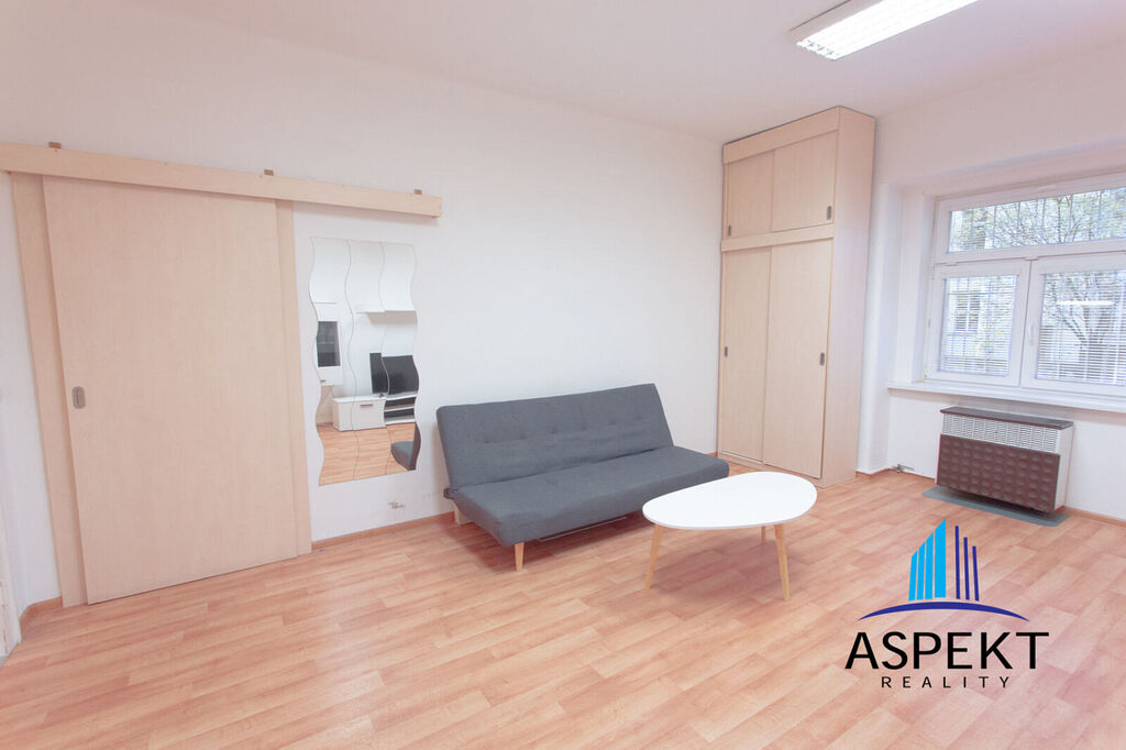 Byt je částečně vybavený viz aktuální fotografie. Dispozice zahrnuje vstupní chodbu, prostorný obývací pokoj a ložnici s výhledem do klidného zeleného vnitrobloku, který nabízí možnost posezení a relaxace. Samostatný kuchyňský kout (bez okna) je prakticky oddělený.
