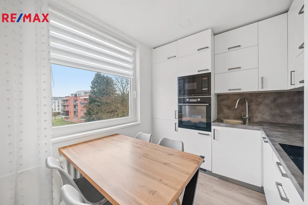 Součástí vybavení je moderní kuchyňská linka s vestavěnou lednicí, mrazákem, indukční varnou deskou, mikrovlnnou troubou, elektrickou troubou a myčkou. V bytě je k dispozici také nadstandardní úložný prostor.