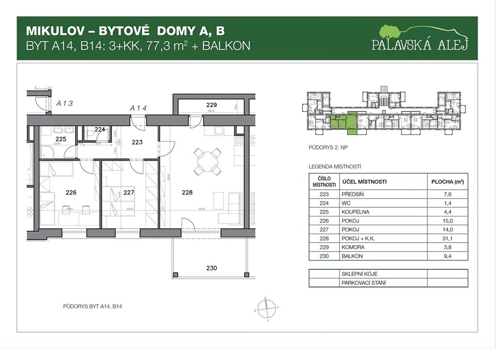 Nachází se v 2.np bytového domu v Pálavské aleji. Byt má prostornou a vzdušnou hlavní místnost s kuchyňským zázemím, velká okna a přímý vstup na balkón o rozloze 9,5m2. V hlavní místnosti je k dispozici ještě velká komora. Kuchyňská linka obsahuje sklokeramickou desku, elektrickou troubu a dřez.