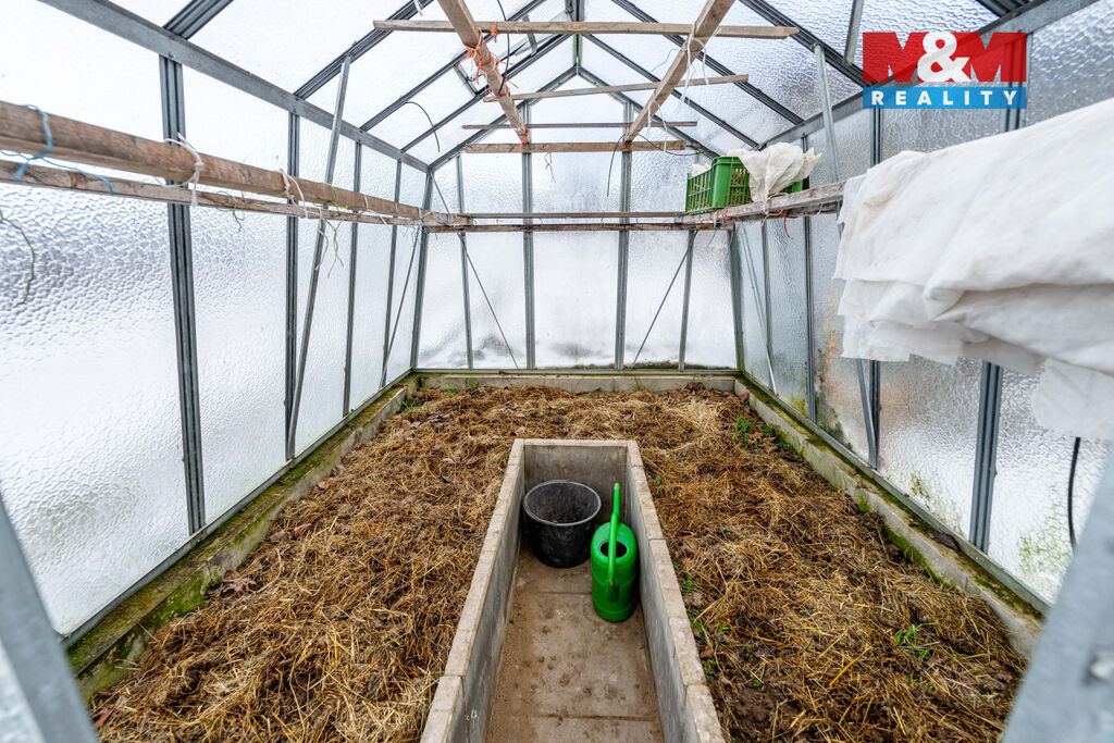 Pozemek je napojen na elektřinu, má vrtanou studnu (30 m), dva vjezdy a členěnou zahradu – okrasnou část, ovocný sad, záhony i prostor pro drobnochov.