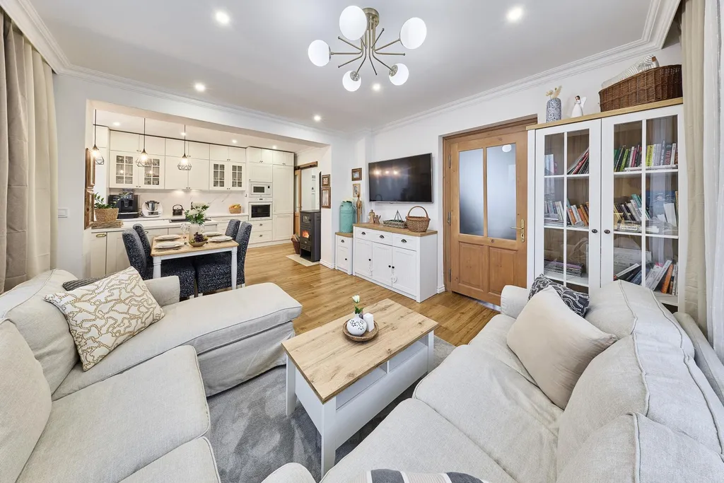 Z ulice vcházíte brankou po dlážděném chodníku k hlavnímu vchodu na verandu, odkud lze vejít jak do obytné části domu, tak do zahrady za domem nebo do suterénních prostor. Z verandy vcházíte do vstupní chodby se schodištěm. V přízemí se nachází moderní kuchyně s ostrůvkem a dřezem s vestavěnou myčkou, bílá luxusní kuchyňská linka má moderní vestavěné spotřebiče, díky kterým připravíte skvělé pochoutky pro své nejbližší. Kuchyně je propojena s obývacím pokojem, vše ve světlých barvách. Z obývacího pokoje vejdete do ložnice. V přízemí je také vkusně vybavená koupelna se sprchovým koutem a toaletou v bílo - zlatém designu.