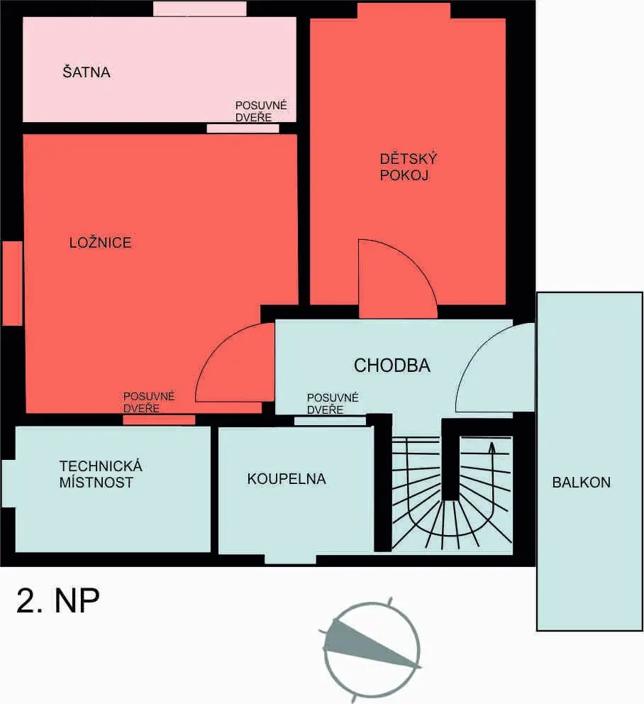 Schodištěm z chodby vystoupáte do 2. nadzemního podlaží, které Vás znovu nadchne. Zde se nachází dětský pokoj, druhá ložnice s prostornou šatnou, druhá koupelna s vanou a toaletou a technická místnost s bojlerem, sušičkou a pračkou a s úložnými prostory. Slunit se můžete také na balkoně, kam vcházíte z chodby nad schodištěm, balkon je izolovaný bez položené dlažby, zábradlí je třeba upravit do finální podoby.