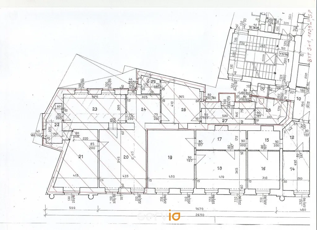 Byt má jednu místnost předsíně, ze které se vstupuje do místnosti chodby, a dále do místnosti kuchyně (dříve dvě místnosti v půdorysu označené 24 a 26, nyní spojené v jednu velkou místnost kuchyně), kdy z místnosti kuchyně je vstup i do místnosti komory označené v půdorysu 25. Byt má dále tři samostatné pokoje (dva s okny do ulice Masarykova a jeden s okny do dvora), dále místnost koupelny, kde je vana a WC, a dále i ještě jednu samostatnou místnost s dalším WC, do které se vstupuje z předsíně.