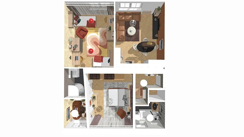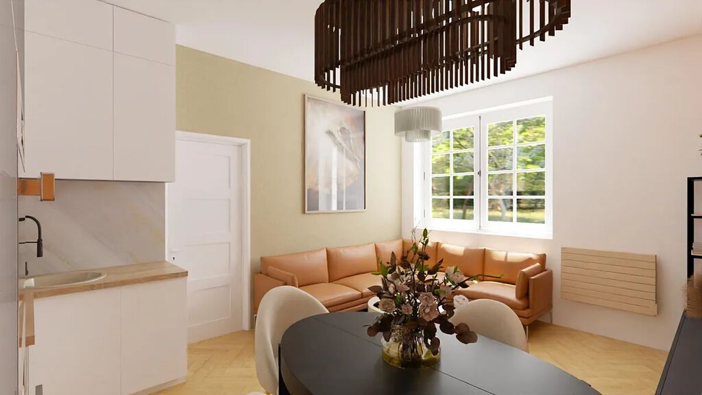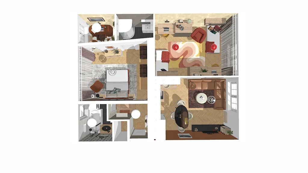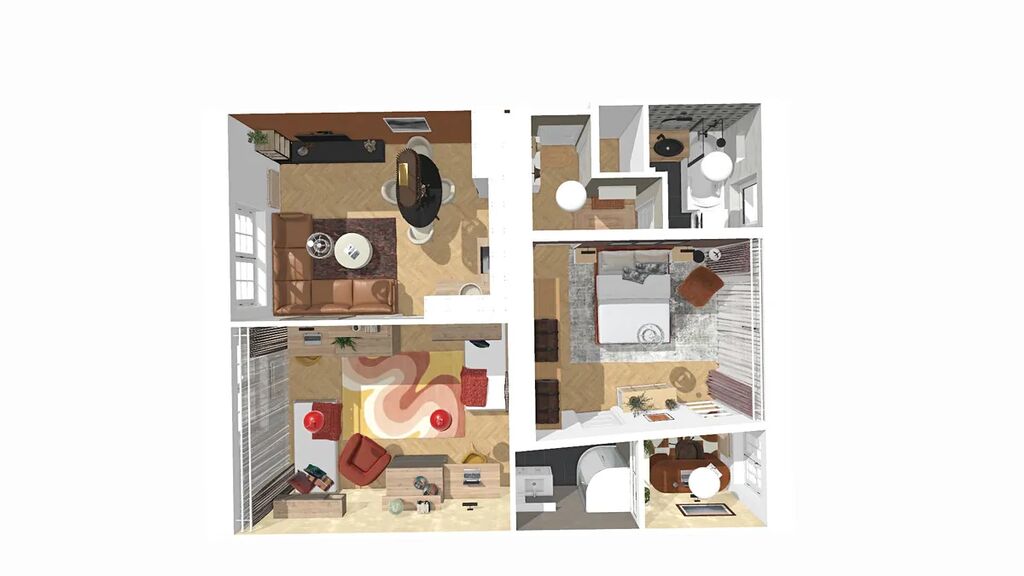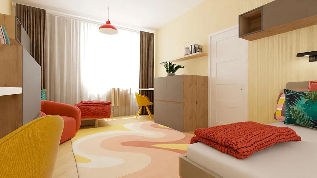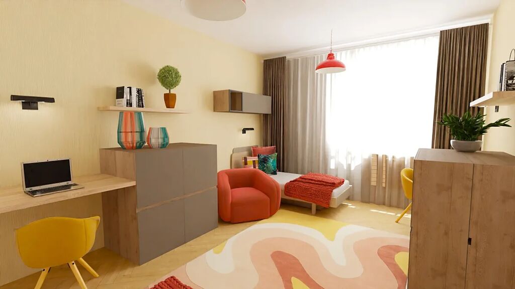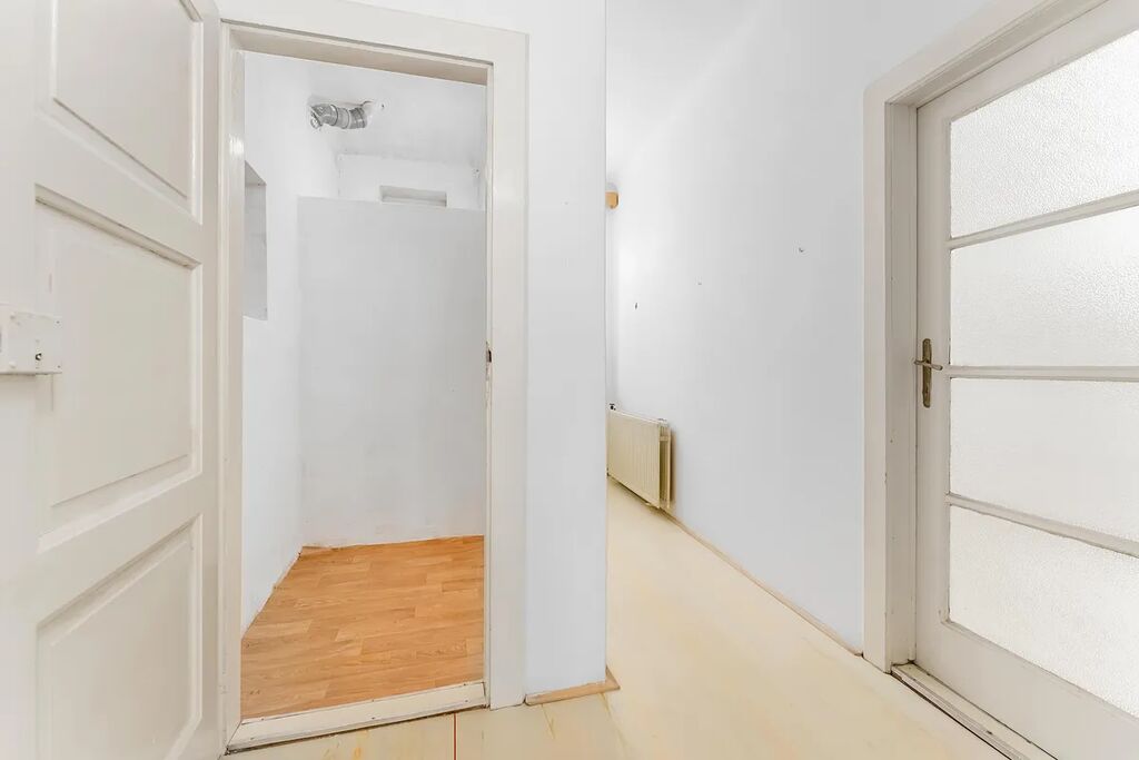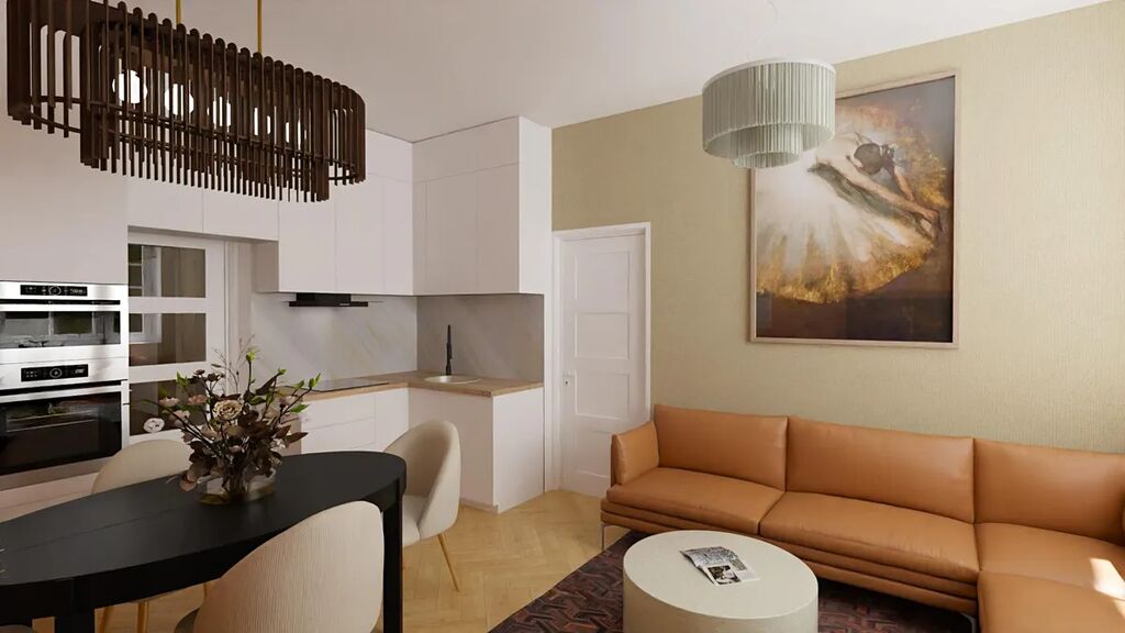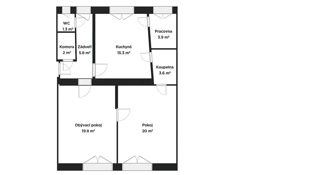 Aktuální dispozice bytu nabízí dva velmi prostorné pokoje o výměrách 19,8 a 20 m2, kde v levém pokoji je poměrně snadné vybudovat kuchyňskou linku a současnou kuchyni tak přetvořit na ložnici orientovanou do vnitrobloku. K ložnici by pak náležela pracovna či šatna o výměře 3,9 m2.