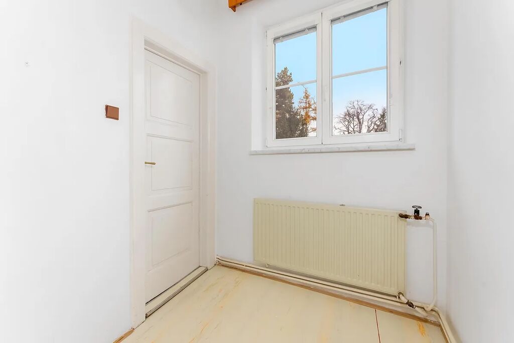 Dříve zde býval pokoj služebné a víme, že se sem vejde i postel. Díky dvěma stupačkám je tu i možnost dobudovat druhou koupelnu v místě, kde se nyní nachází chodba a toaleta. Inspirovat se můžete v galerii, kde kromě původního půdorysu najdete také možnost nového rozložení a vizualizace možného nového stavu bytu.