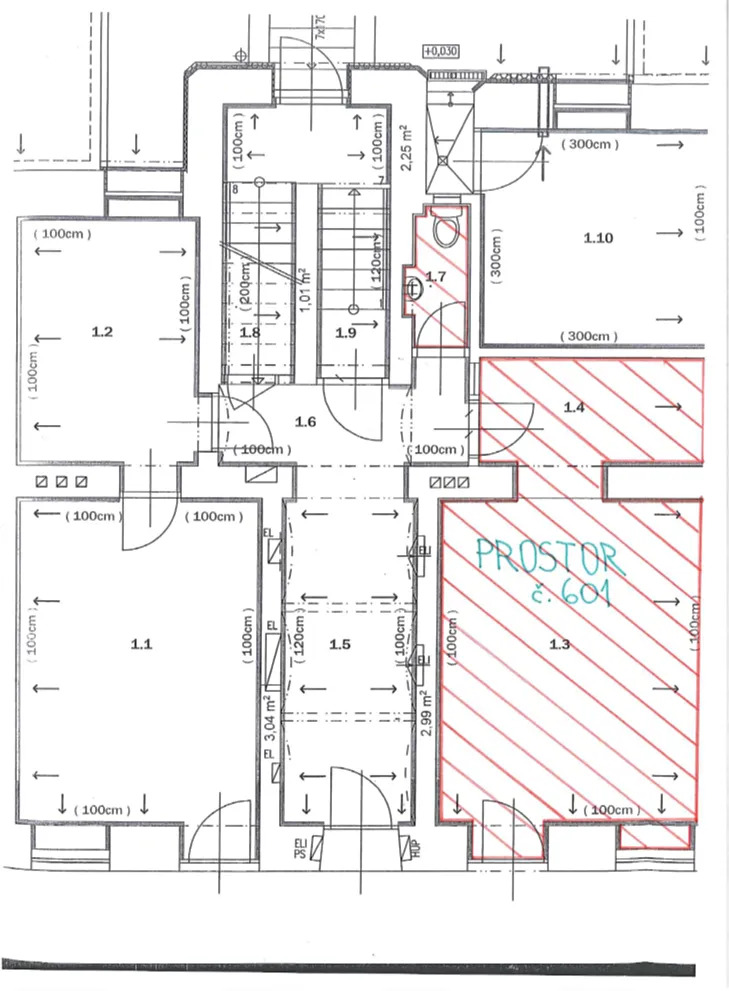 Nebytový prostor má celkovou plochu 26 m2 a sestává z prodejní místnosti o výměře 20,3 m2 a zázemí o výměře 5,7 m2, viz půdorys. Spolu s nebytovým prostorem č. 601 bude nájemce užívat společné WC o výměře 1,9 m2 nacházející se v přízemí výše uvedené budovy, které je přístupné přes společné prostory budovy a je společné s nájemcem sousedního nebytového prostoru. V prostoru proběhne do 30.01.2026 výměna dveří včetně zárubní služebního vchodu umístěného ve společné chodbě domu za protipožární dveře.