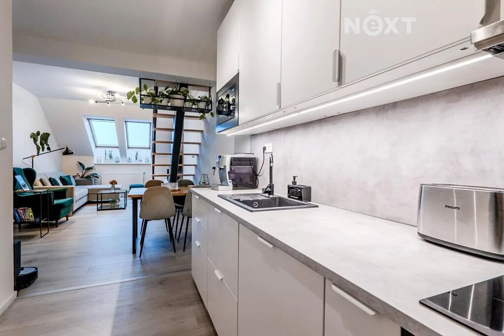 V bytě je k dispozici předsíň (5,4 m2), ze které je vstup do koupelny (4,5 m2) se sprchou, umyvadlem, toaletou a do obývacího pokoje (19,6 m2) s kuchyňským koutem (6,5 m2). Ranní kávu si za teplých dní můžete vychutnat v lodžii (4,8 m2) navazující na ložnici (12,2 m2) přístupnou z obývacího pokoje. Z obývacího pokoje se doslova vznáší jednoramenné schodiště do podkrovního pokoje (23,5 m2). Ústřední vytápění bytu a ohřev TUV zajišťuje vlastní zánovní kotel na zemní plyn . Bonusem tohoto bytu je i instalovaná klimatizace.