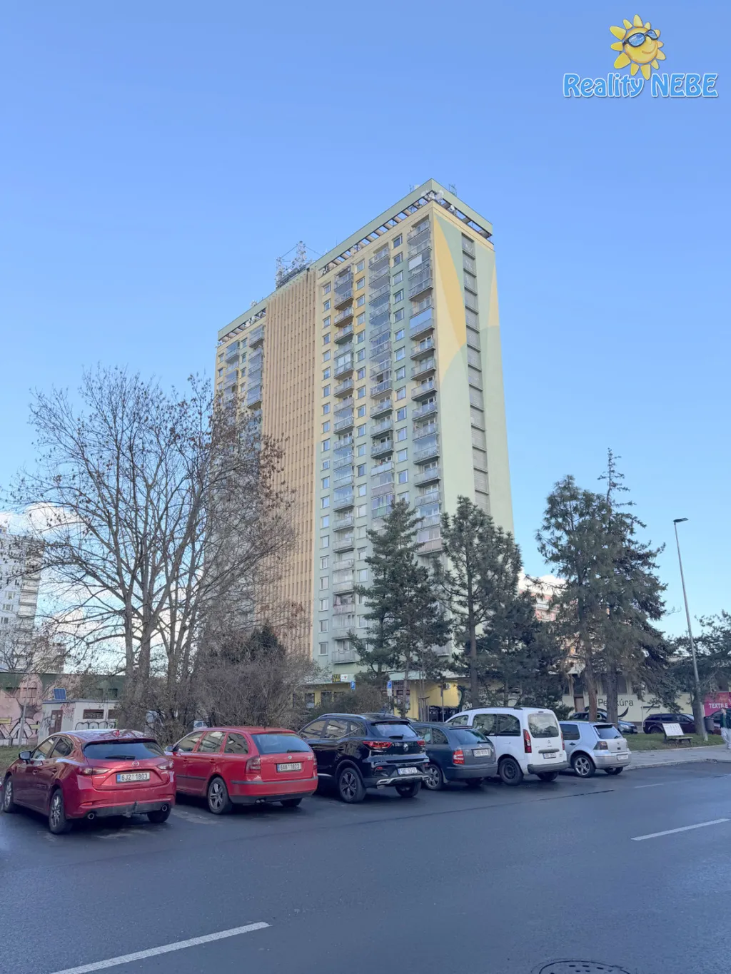 Byt se skládá z jedné ložnice s vestavnou šatí skříní a vstupem na zasklenou lodžii (s klimatizační jednotkou), dále samostatný pokoj s kuchyňským koutem (linka se spotřebiči, trouba, sporák, lednice s mrazákem, jídelní stůl a židle), koupelna se sprchou, WC a pračkou. Celý byt je orientován na JZ stranu, tedy sem celý den svítí slunce, je velmi světlý, teplý a díky jedinečnému umístění na vrcholu zahradního města a výšce 13ho podlaží je odsud nádherný panoramatický výhled na celou Prahu.