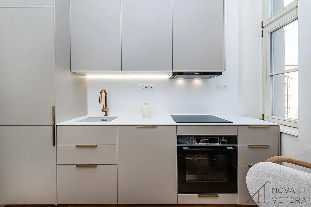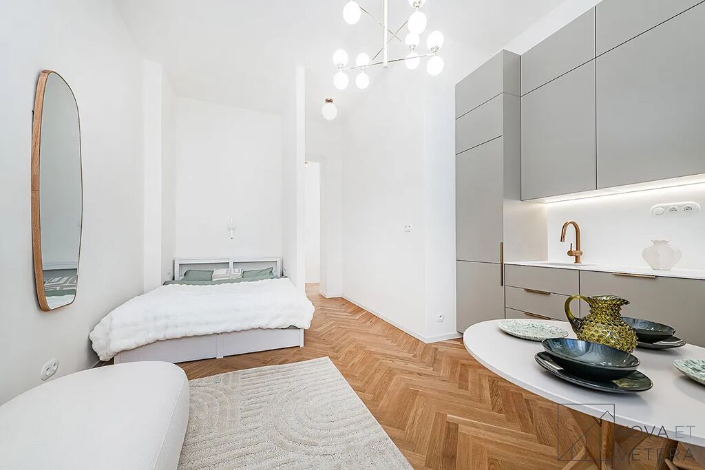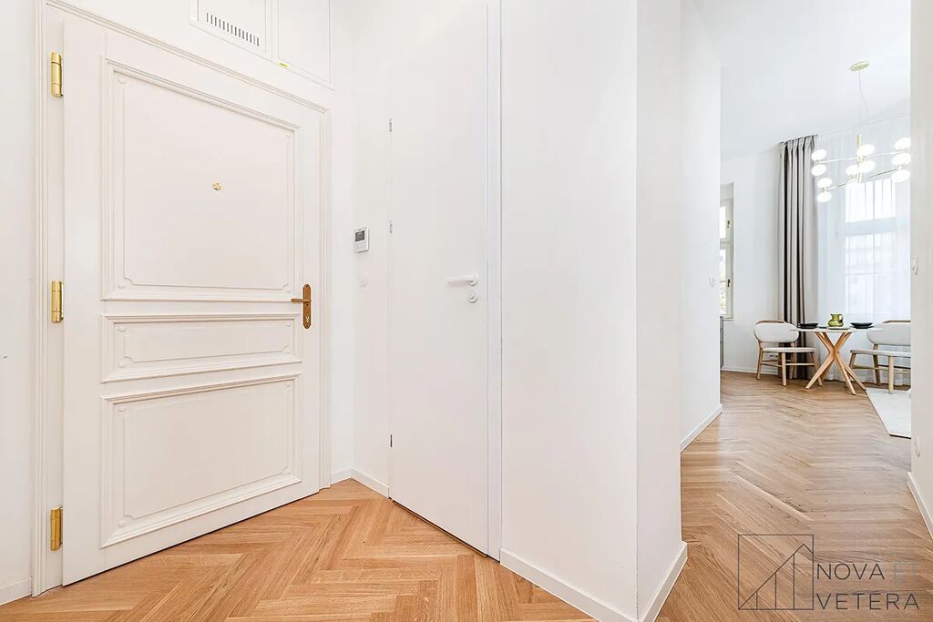 Vysoký standard kompletní rekonstrukce zahrnuje nové rozvody elektřiny, vody a odpadů. Dále rekonstrukce zahrnuje dřevěné parketové podlahy, kvalitní velkoformátové obklady a dlažbu od italského dodavatele MARAZZI. V koupelně a na toaletě naleznete sanitu značky GROHE. Moderní kuchyňská linka disponuje mimo jiné kvalitními spotřebiči značky BOSCH, kameninovou deskou na míru a zapuštěným granitovým dřezem.