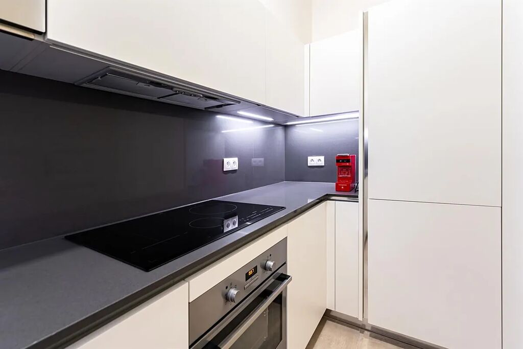 Interiér bytu je zařízen italským designovým nábytkem. Dispozičně byt nabízí vstupní chodbu (11m2), prostorný světlý obývací pokoj (33m2) s jídelním prostorem a se vstupem do kuchyně vybavené moderní kuchyňskou linkou včetně spotřebičů (varná deska, trouba, lednice s mrazákem, myčka, digestoř). Dále jsou v bytě dvě samostatné ložnice (18m2 a 16m2) a dvě koupelny (jedna s vanou, toaletou a bidetem a druhá se sprchovým koutem a toaletou). Podlahy tvoří krásné zrekonstruované parkety a dlažba v koupelnách. K bytu náleží sklep. V budově se také nachází posilovna.