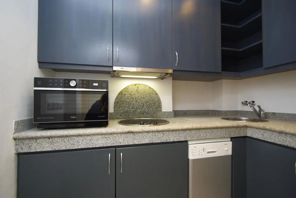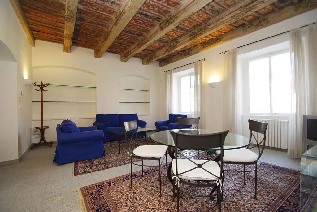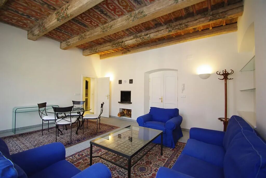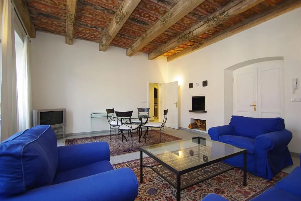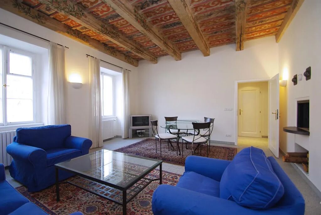 Interiér bytu je vkusně zařízen orientálními koberci a renesančními klenbami a dispozičně se skládá z obývacího pokoje (2 pohovky, satelitní TV, DVD) s jídelním stolem, originálními malovanými barokními stropy a krbem, kuchyně se spotřebiči (myčka, mikrovlnná trouba, elektrická varná deska, lednice), dvou ložnic, jedna s vestavěnými skříněmi, dvou koupelen (jedna s rohovou vanou, druhá se zapuštěnou kachlovou vanou), komory a vstupní chodby s vestavěnou skříní.