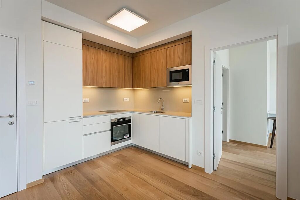 Moderní, plně zařízený byt 2+kk (1 ložnice, 1 koupelna), s terasou (11,48m2) a celkovou plochou 89,58m2, je situován ve 3. NP zcela nového luxusního rezidenčního komplexu s výtahem, recepcí, bazénem, saunou, prostornou zahradou ve dvoře, sklepem a možností parkování v podzemním parkovišti.