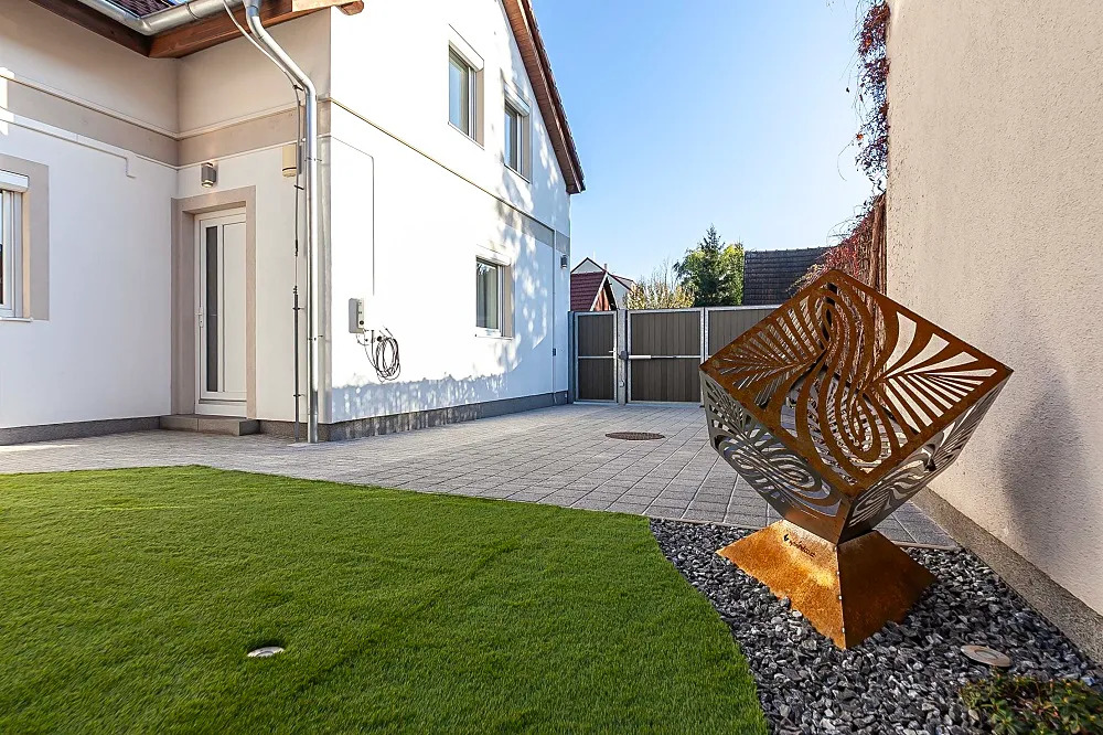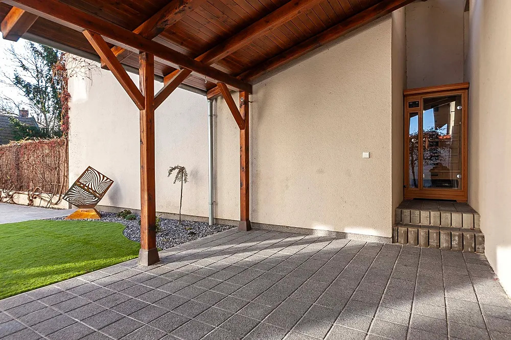 Dům je vybaven klimatizací, fotovoltaikou a nabíjecí stanicí pro automobil, předokenními roletami s el. pohonem, krbem, podlahovým vytápěním, venkovním skladem/dílnou, infrasaunou. Topení a teplou vodu zajišťuje plynový kondenzační kotel. Parkování je možné na dvoře nemovitosti, případně před domem. Majitel domu volil při výstavbě domu nadstandardní zařizovací prvky od kvalitních výrobců.
