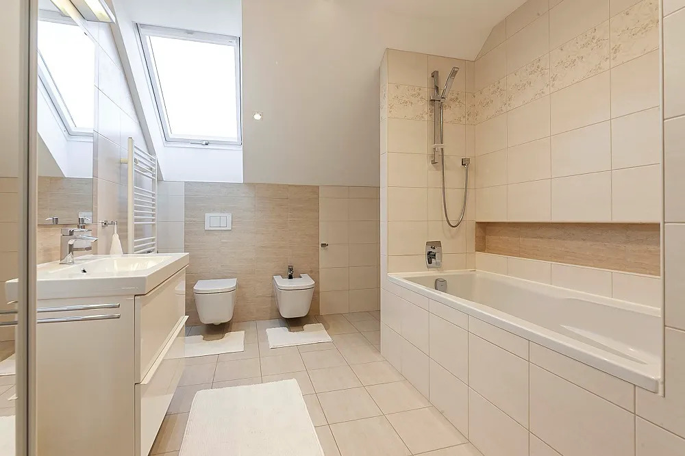 V přízemí domu je nájemci k dispozici vstupní chodba s vestavnou skříní, prostorný obývací pokoj se vstupem na zahradu, plně vybavený kuchyňský kout, jídelna, koupelna se sprchovým koutem, samostatná toaleta, technická místnost. Ve 2.NP jsou pak k dispozici 3 ložnice, koupelna s vanou toaletou a bidetem, šatna.