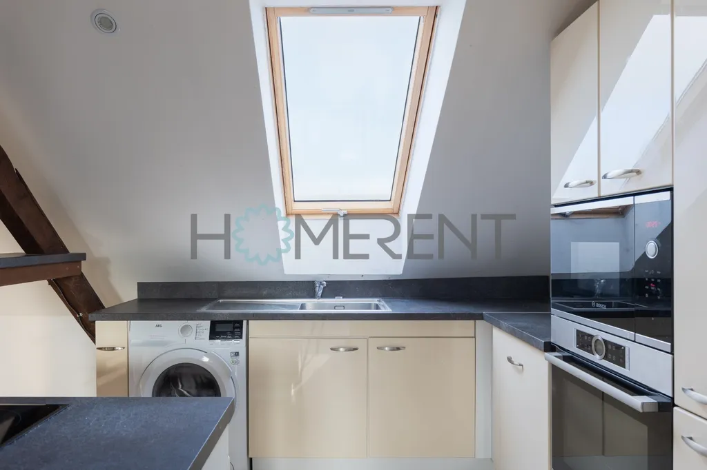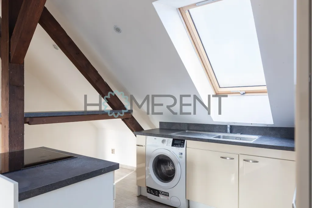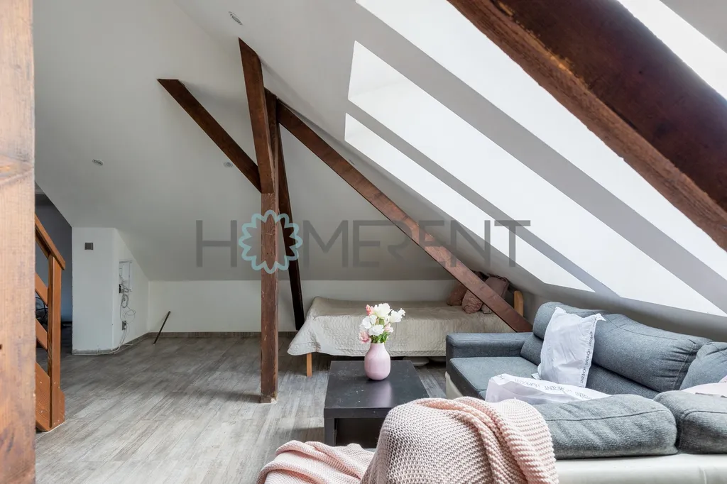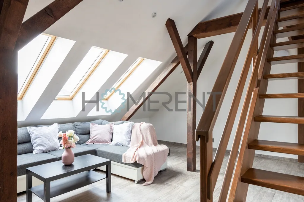 Tento podkrovní prostor potěší každého, kdo hledá netradiční bydlení s atmosférou, charismatem a množstvím denního světla. Otevřený vzdušný interiér, krásné dřevěné trámy a několik střešních i stropních oken vytvářejí příjemné prostředí, které působí teple, útulně a zároveň moderně.