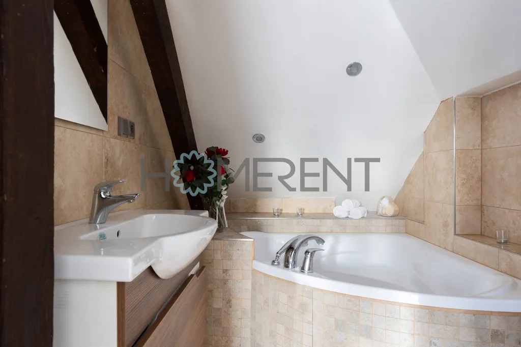 Kuchyně je moderně zařízená a kompletně vybavená. Koupelna nabízí dostatek prostoru a je vybavena velkou rohovou vanou, která je skvělá pro relax po dlouhém dni.