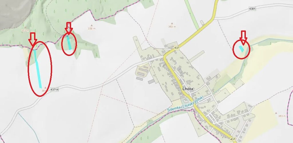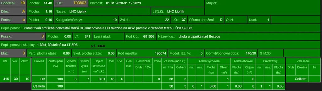 - p.č. 1360 vedená jako lesní pozemek o celkové výměře 749 m2 (stáří lesa 35 let - zastoupení dřevin dub),