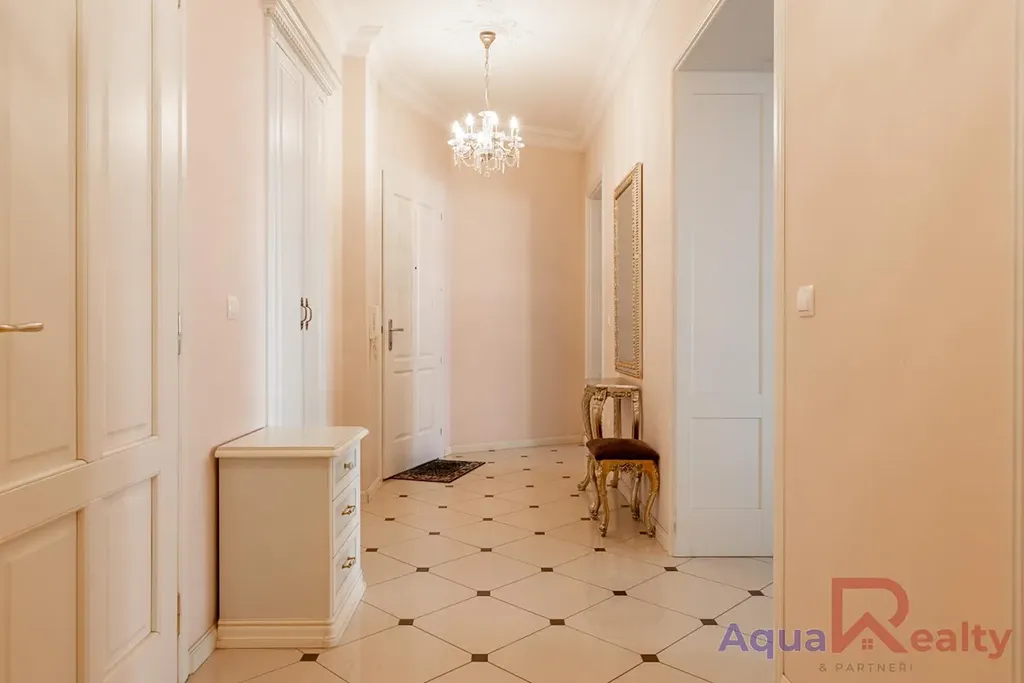Dispozice bytu zajišťuje pohodlné a reprezentativní bydlení jak pro rodinu, tak pro náročné zájemce, kteří hledají dostatek prostoru a soukromí. Východní část tvoří světlý obývací prostor s kuchyní, pracovna a menší ložnice všechny tyto místnosti mají přímý vstup na prostorný balkon orientovaný do ulice. Západní část nabízí velkorysou hlavní ložnici s vlastním balkonem do klidného vnitrobloku.