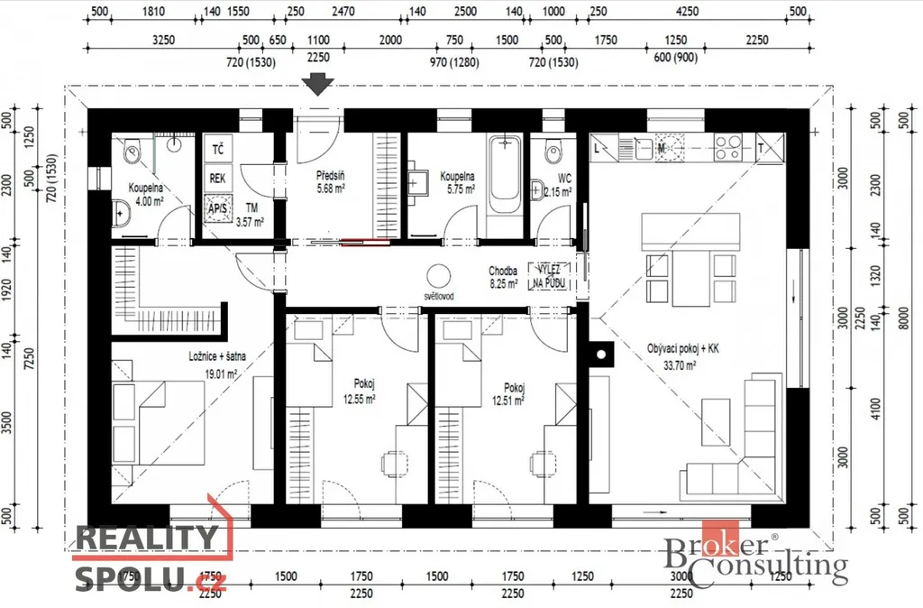 Dům o dispozici 4+kk s podlahovou plochou 107 m² je navržen tak, aby poskytoval maximální komfort pro rodinu. Dominantou je prostorný obývací pokoj s přímým vstupem na terasu o ploše 45 m² a dále na zahradu orientovanou do soukromí za domem. Velkou výhodou jsou také dvě koupelny, které výrazně zvyšují praktičnost domu.