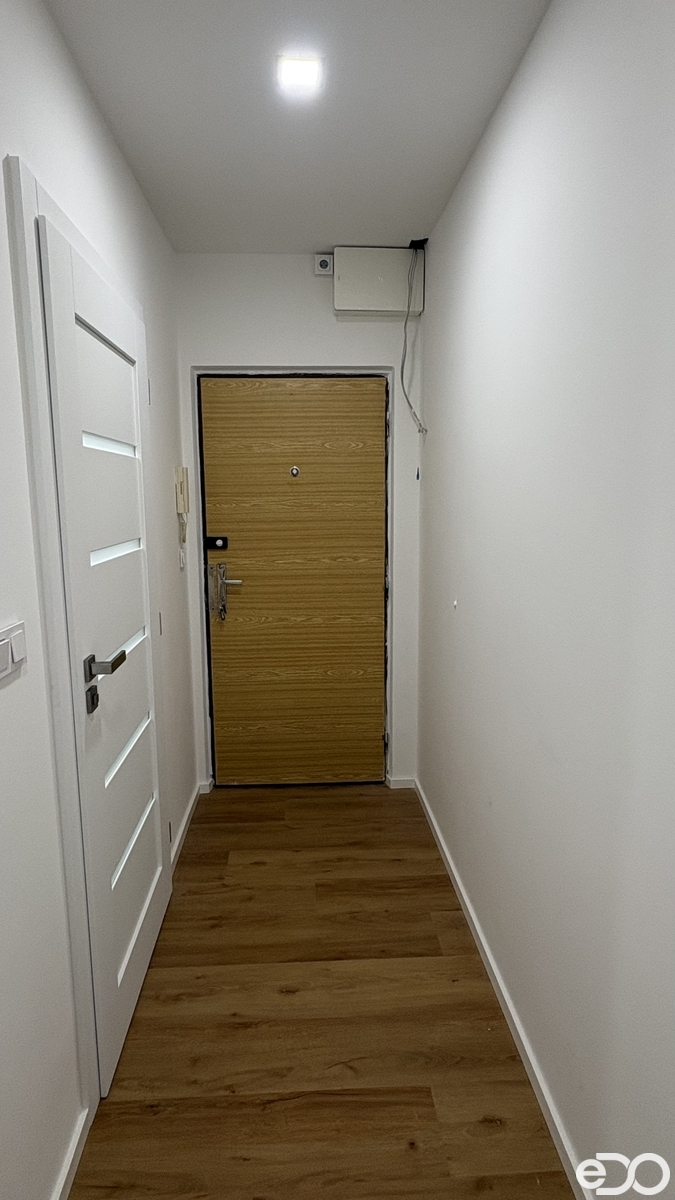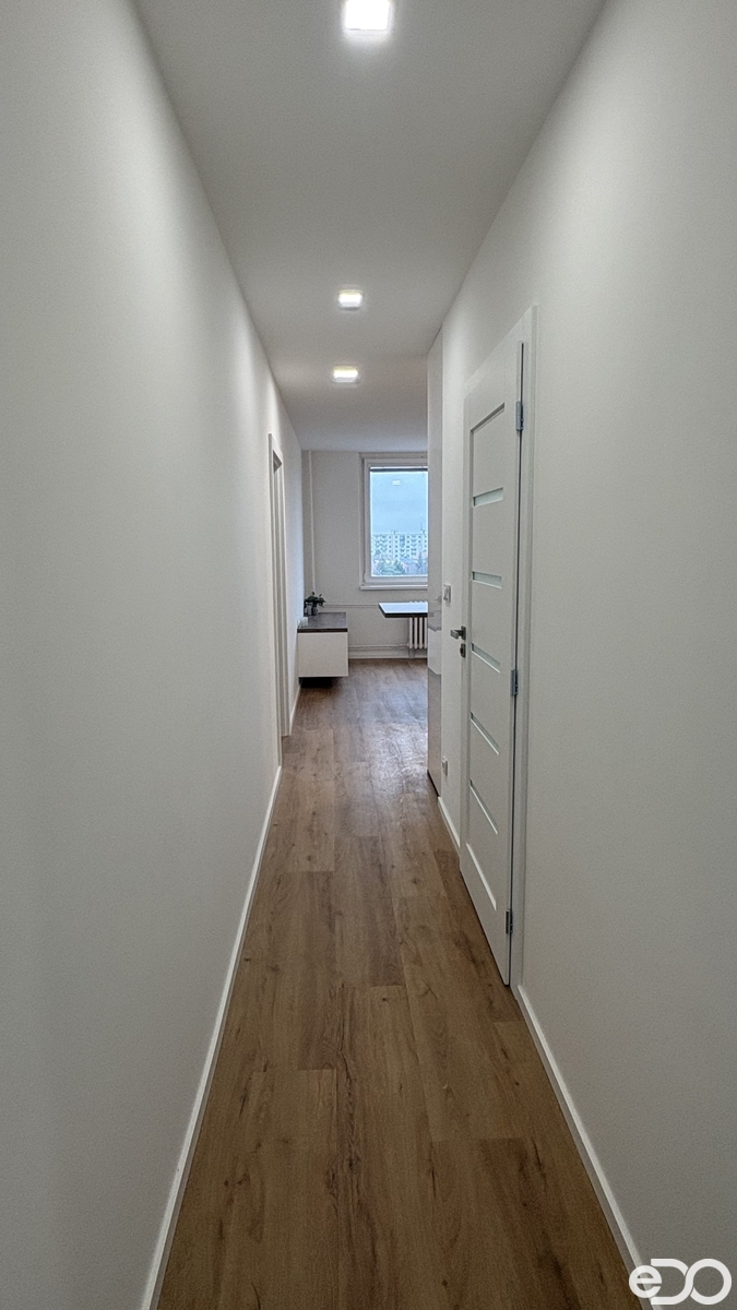 Po vstupu do bytu Vás přivítá dlouhá chodba s jednotnou vinylovou podlahou, novými dveřmi a příjemným stropním osvětlením, které celé působí velmi upraveně.