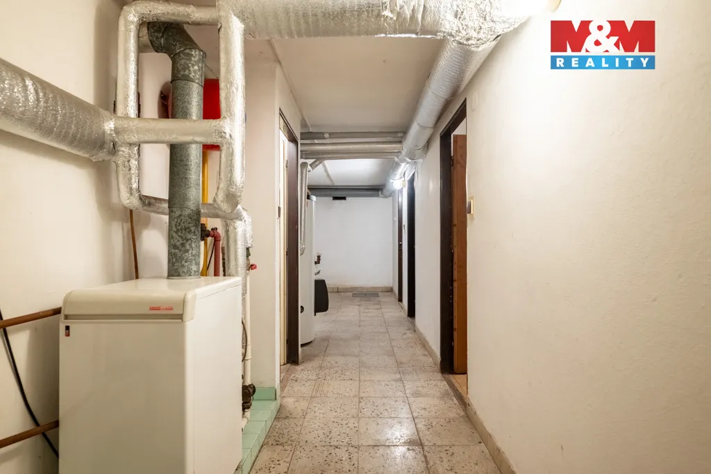 Ve sklepních prostorách se nachází kompletní technické zázemí. Součástí domu je garáž, na kterou navazuje dílna a průchod na zahradu se skleníkem.